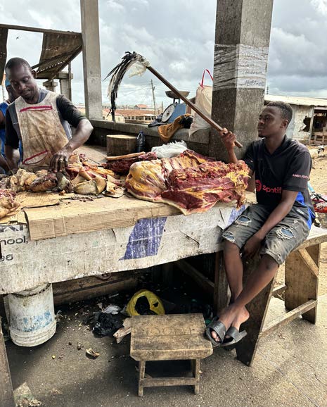 This trip I discovered a grace provision for the people of Ghana related to their food supply. For most Ghanaians, the butcher shop where they obtain beef and chicken is a local open air meat market complete with cattle stockyards and chicken pens, and all the odors you might expect with such (pictures below). Not being wasteful, Ghanaians eat the meat of cow plus the cartilage (a source of calcium), the liner of the belly, and the liver. The meat sits in the heat of the market throughout the day until it is sold. That presents the opportunity for bacteria that causes food poisoning. However, Ghanaians cook their food with hot green and red peppers, which have an active ingredient that kills the bacteria that causes food poisoning. That’s God’s grace to the Ghanaians.